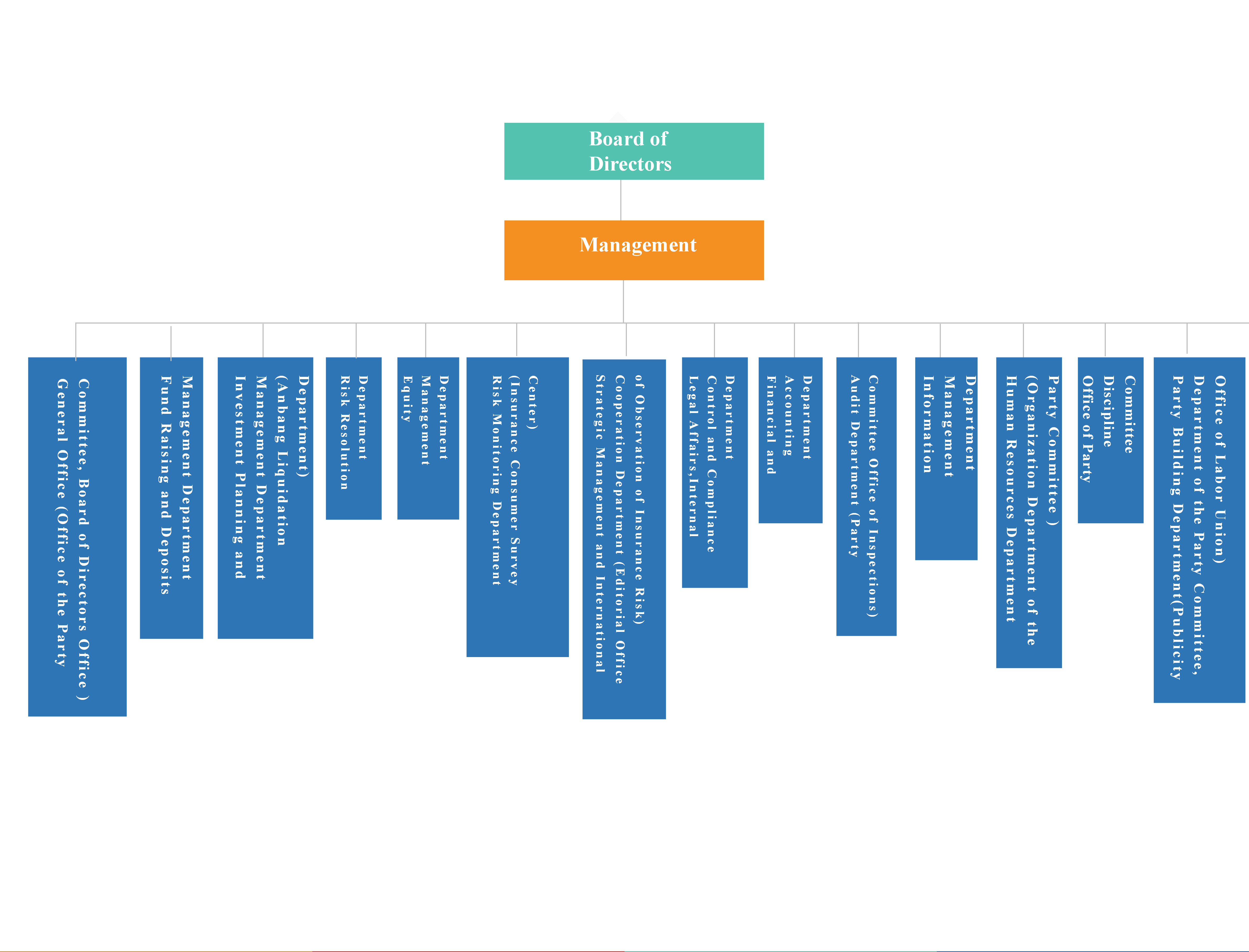 At present, CISFC consists of 14 internal offices and departments:General Office (Office of the Party Committee, Board of Directors Office );Fund Raising and Deposits Management Department;Investment Planning and Management Department (Anbang Liquidation Department);Risk Resolution Department;Equity Management Department;Risk Monitoring Department (Insurance Consumer Survey Center);Strategic Management and International Cooperation Department (Editorial Office of Observation of Insurance Risk);Legal Affairs,Internal Control and Compliance Department;Financial and Accounting Department;Audit Department (Party Committee Office of Inspections);Information Management Department;Human Resources Department (Organization Department of the Party Committee );Office of Party Discipline Committee;Party Building Department(Publicity Department of the Party Committee, Office of Labor Union).